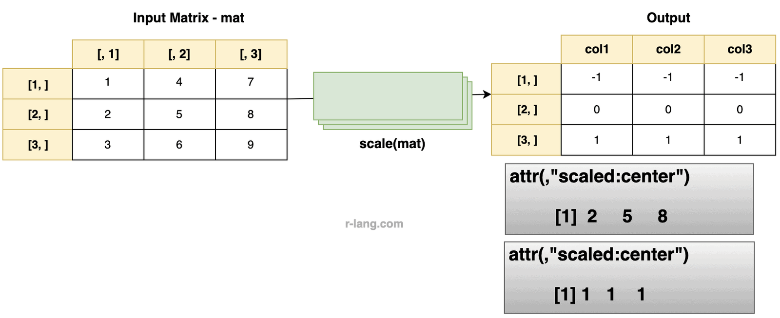 After scaling, each column will have a mean of zero and a standard deviation of one, assuming center = TRUE and scale = TRUE.